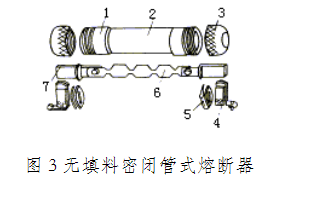 (3)封閉式熔斷器 封閉式熔斷器分有填料熔斷器和無(wú)填料熔斷器兩種,如圖3和圖4所示。有填料熔斷器一般用方形瓷管,內(nèi)裝石英砂及熔體,分?jǐn)嗄芰?qiáng),用于電壓等級(jí)500V以下、電流等級(jí)1KA以下的電路中。無(wú)填料密閉式熔斷器將熔體裝入密閉式圓筒中,分?jǐn)嗄芰ι孕。糜?00V以下,600A以下電力網(wǎng)或配電設(shè)備中。