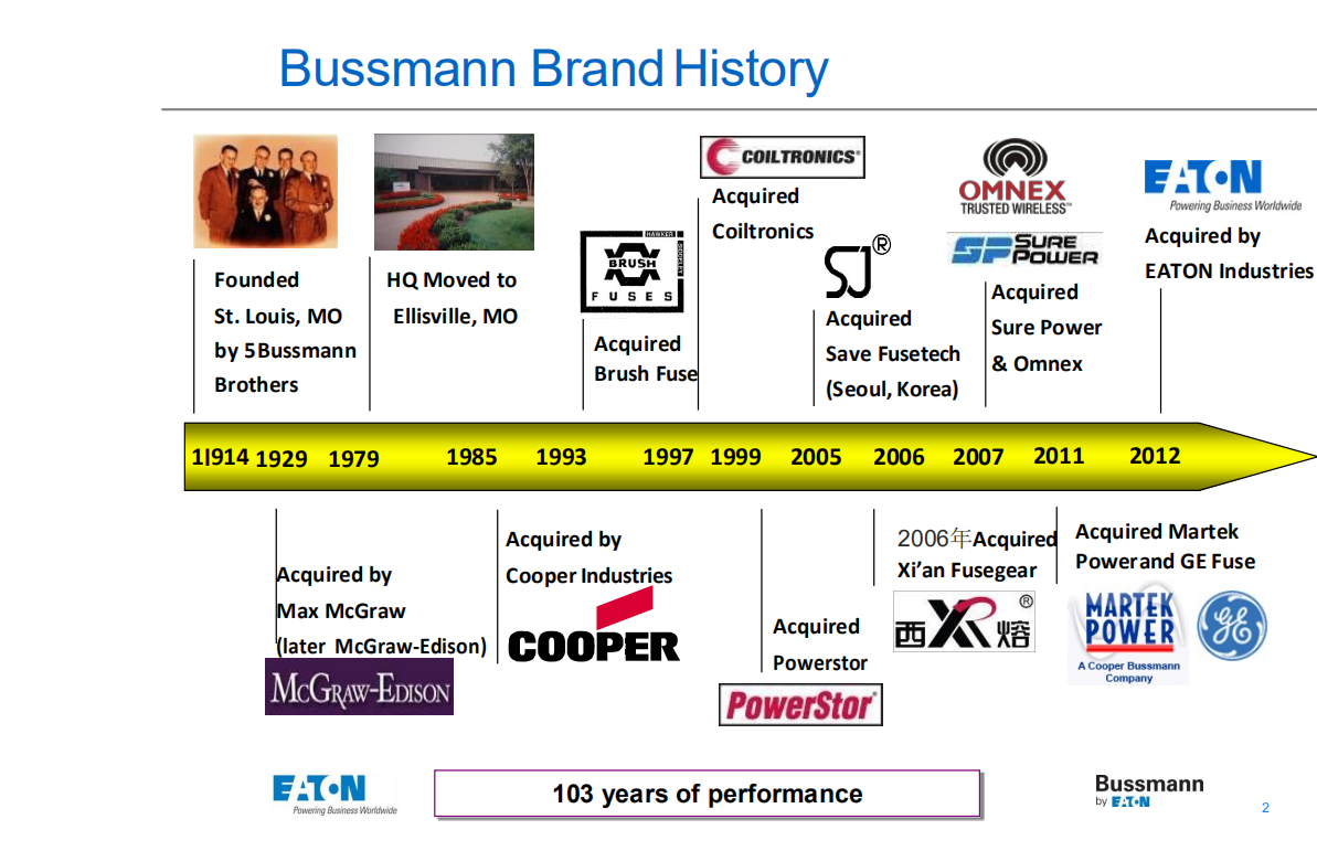 1985年,Cooper(庫柏工業(yè))購買該公司,成立了新的事業(yè)部—“CooperBussmann熔斷器”, 如今它是世界上熔斷器電路保護(hù)及相關(guān)配件的最知名品牌。