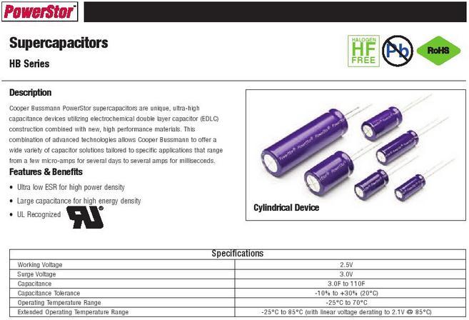 產(chǎn)品型號(hào):型號(hào):HB1635-2R5356-R 品牌: Bussmann 產(chǎn)品種類: 超級(jí)電容/超級(jí)電容器 電容: 35 Farads 容差: - 10 % + 30 % 電壓額定值: 2.5 V ESR: 0.03 Ohms 工作溫度范圍: - 25 C to + 70 C 端接類型: Radial 引線間隔: 7.5