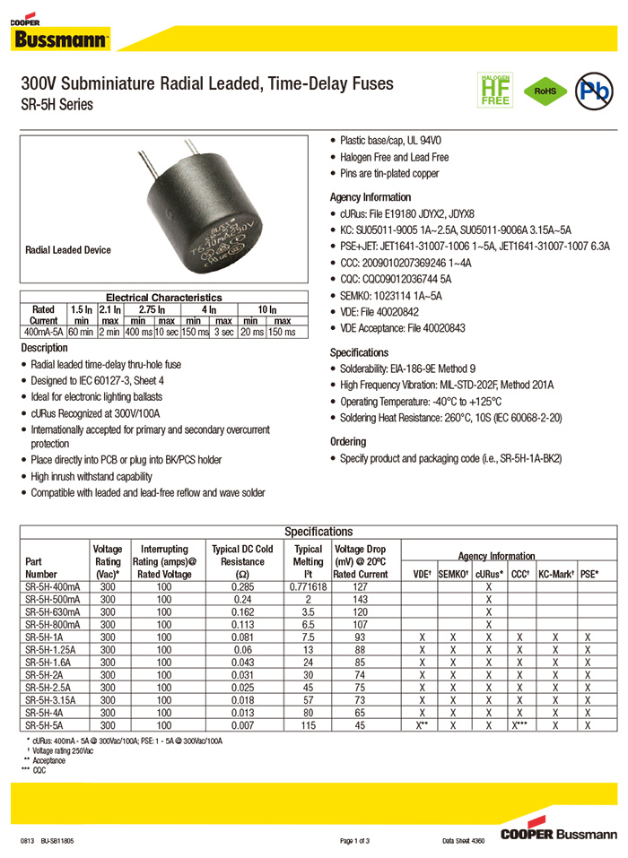 bussmann SR-5H系列 SR-5H-630mA-AP SR-5H-5A-AP SR-5H-800mA-AP SR-5H-4A-AP SR-5H-400mA-AP SR-5H-3.15A-AP SR-5H-2A-AP SR-5H-2.5A-AP SR-5H-1A-AP SR-5H-1.6A-AP SR-5H-1.25A-AP SR-5H-500mA-AP SR-5H-6.3A-AP